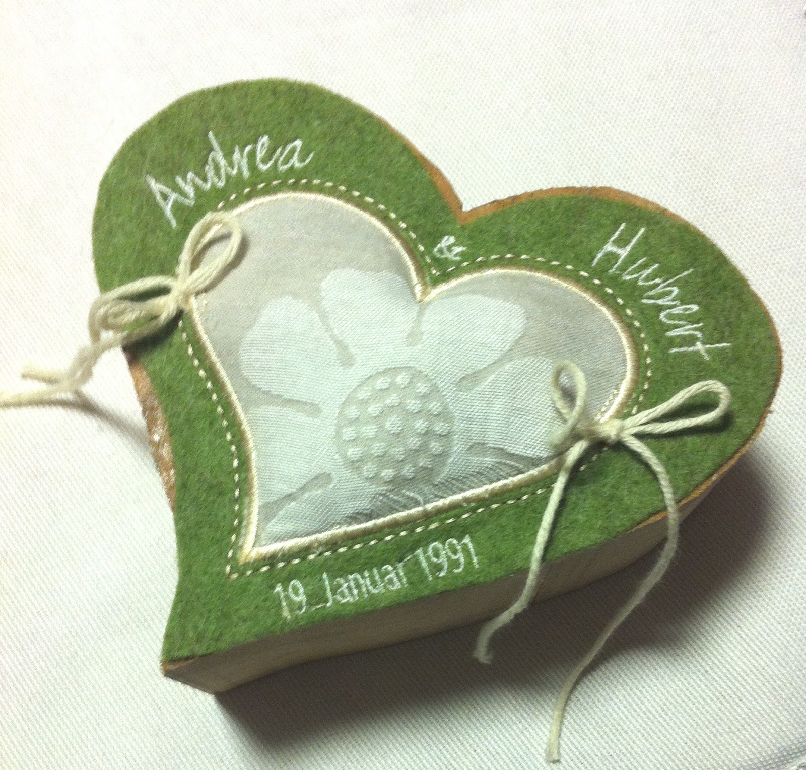 Je nach Kundenwunsch verarbeite ich Stoff und Filz damit das "Ringkissen" dann auch zum Hochzeitskleid und zur Dekoration passt.